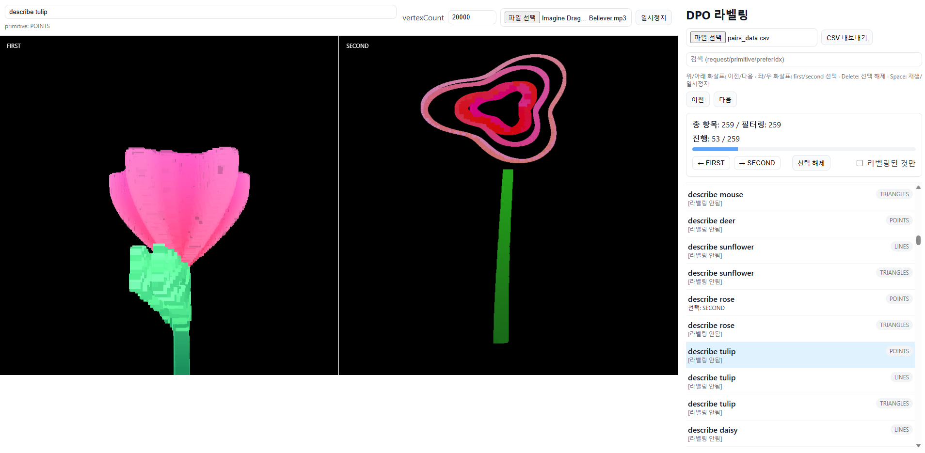 2) 라벨링 툴 제작 : 동시에 VisualSong으로 같은 프롬프트로 생성된 다른 데이터 쌍을 보고, 이를 사용자가 라벨링하게끔 하는 툴.